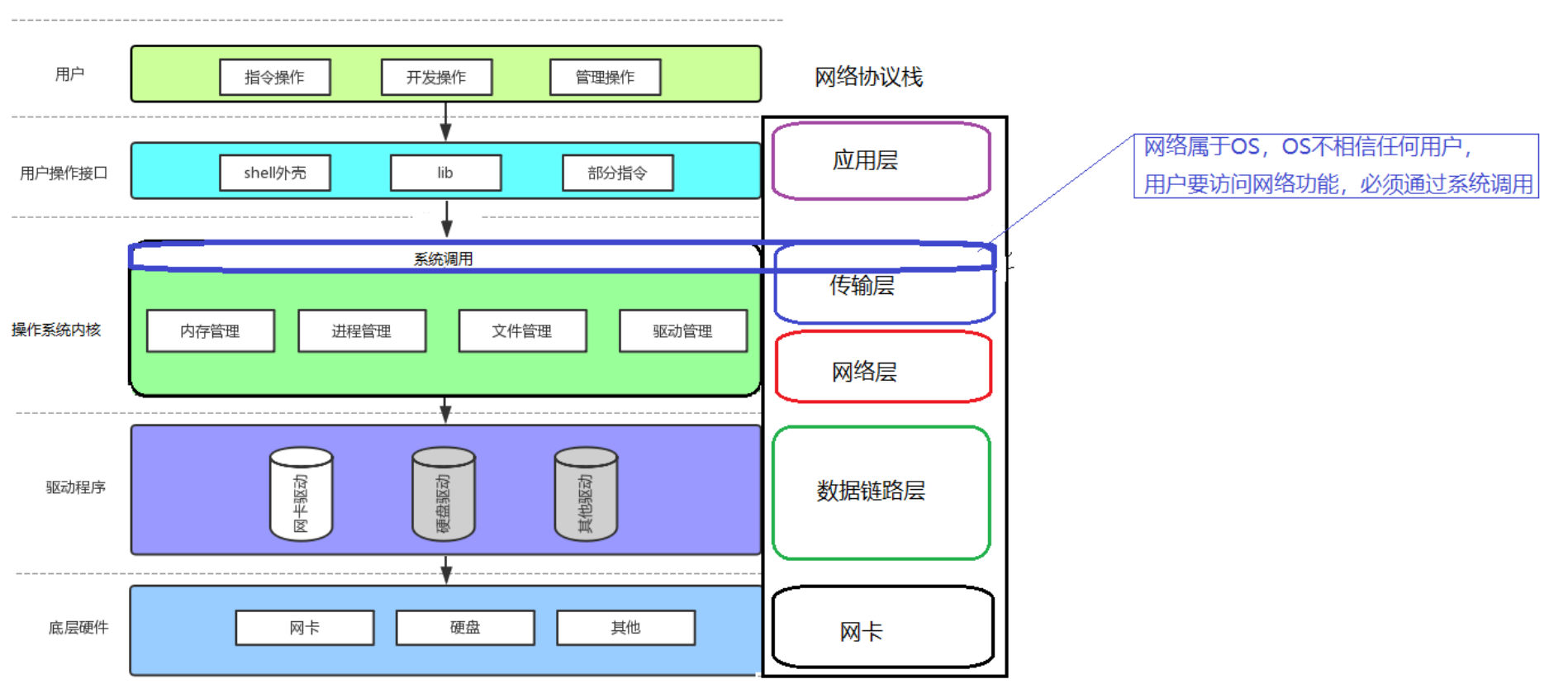 我们前面了解过了Linux系统的知识,也了解了网络协议栈,我们清楚传输层是属于内核的,那么我们要通过网络协议栈来进行网络通信,那么必然调用的就是传输层的系统调用,因为我们所使用的应用层下面紧挨着的就是传输层。