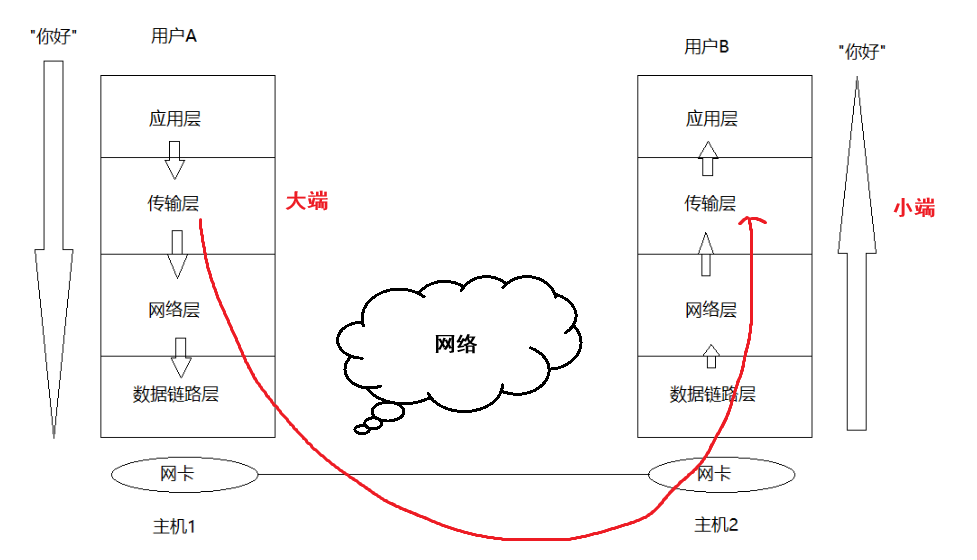 主机1明明想要发的数据是:0x1234abcd,但是传过去后,因为主机2是小端存储,所以主机2读出来的数据就是:0xcdab3412,正好相反,所以为了避免这样的问题,TCP/IP协议规定:网络数据流应采用大端字节序,即低地址高字节。