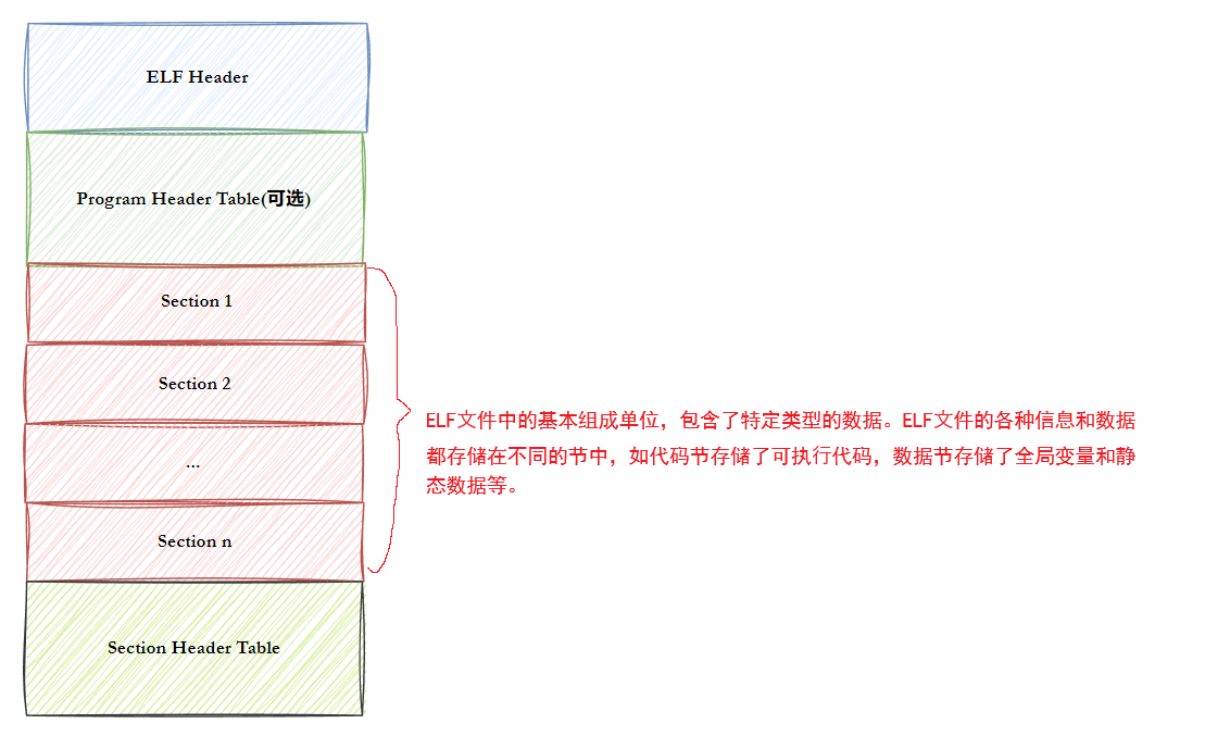 这四个部分分别是:ELF Header(ELF头),Program Header Table(程序头表),Section(节),Section Header Table(节头表)。
