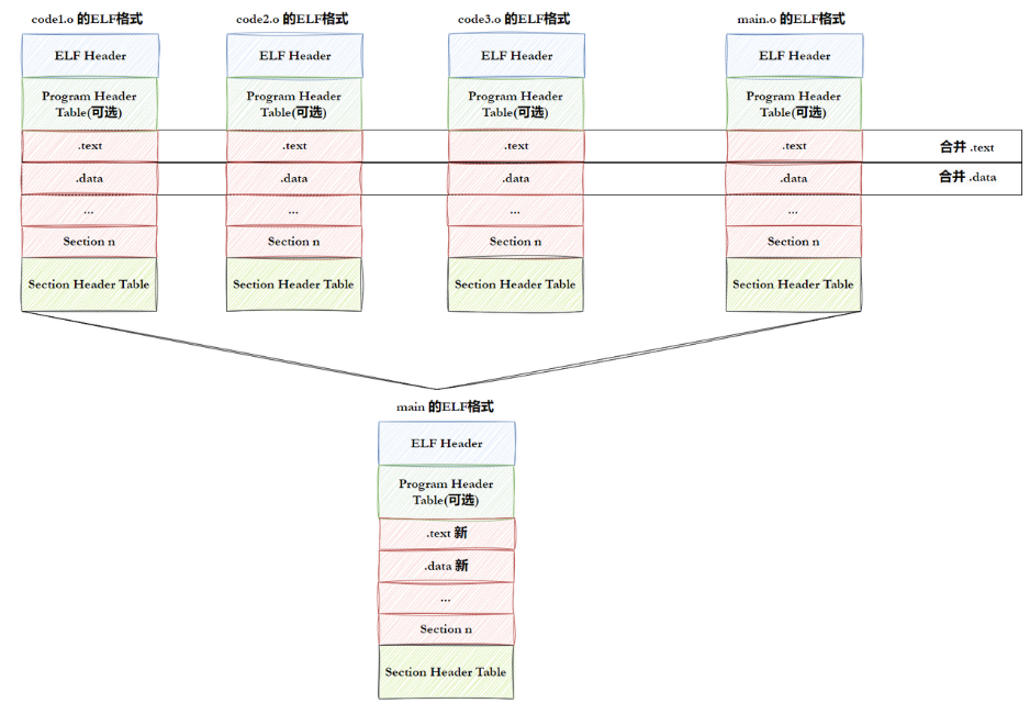 1.将多个.o文件的合并在一起,并进行了统一的编址(在.o文件中run函数和main函数的地址都为0)