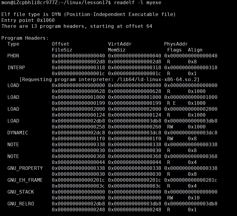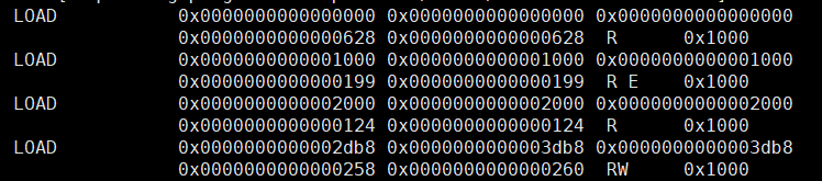 通过readelf -l +文件名的命令我们就可以查看Program Header Table中的内容,可以看到我们整整31个section最后被合并为13个segment了,每个segment都有自己的类型,里面的LOAD我们都认识,这就是需要加载的。