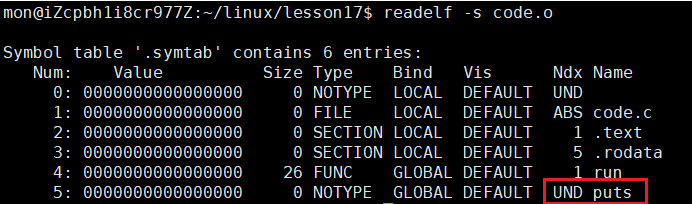 这里我们通过查看两个文件的节头表,可以看到在两个函数前都有UND的字眼,意思就是Undefined,表示这两个函数并没有被定义,puts表示的就是printf函数,它的底层是由puts函数所实现的。