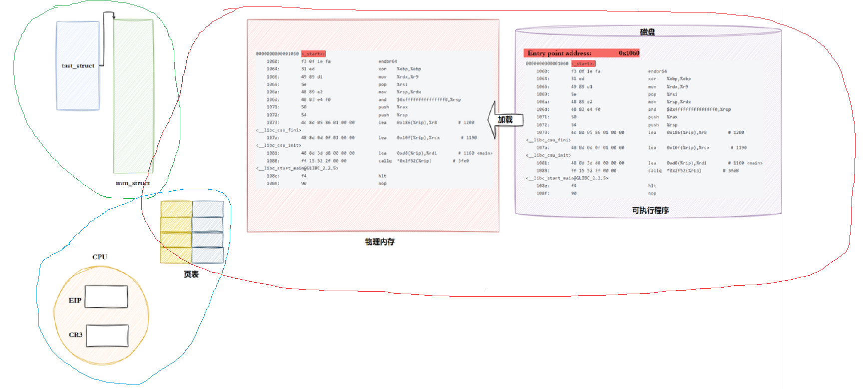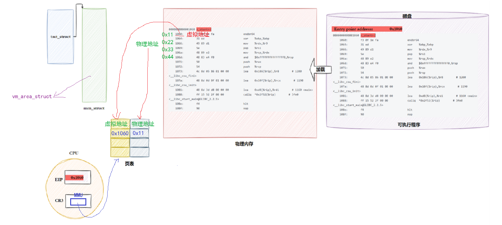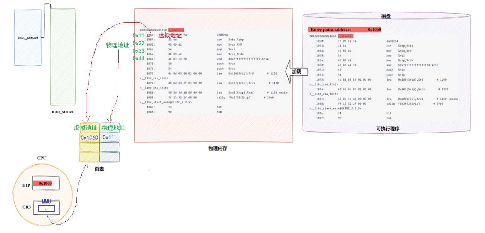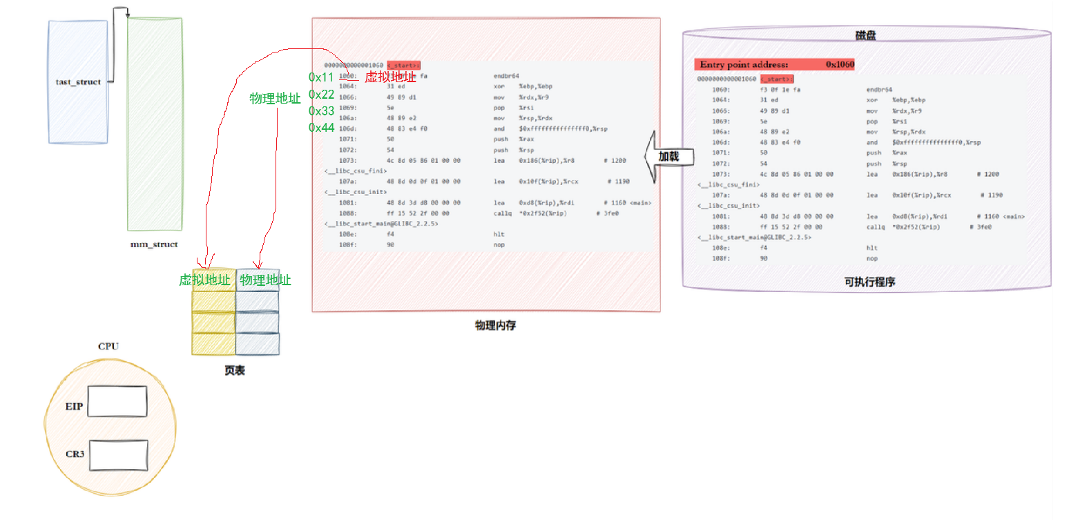 从上图我们就可以得到答案了,可执行文件在加载到内存之前就已经有了虚拟地址,而在加载到内存后,又有了相对应的物理地址,那虚拟地址和物理地址之间的映射关系不就有了吗?