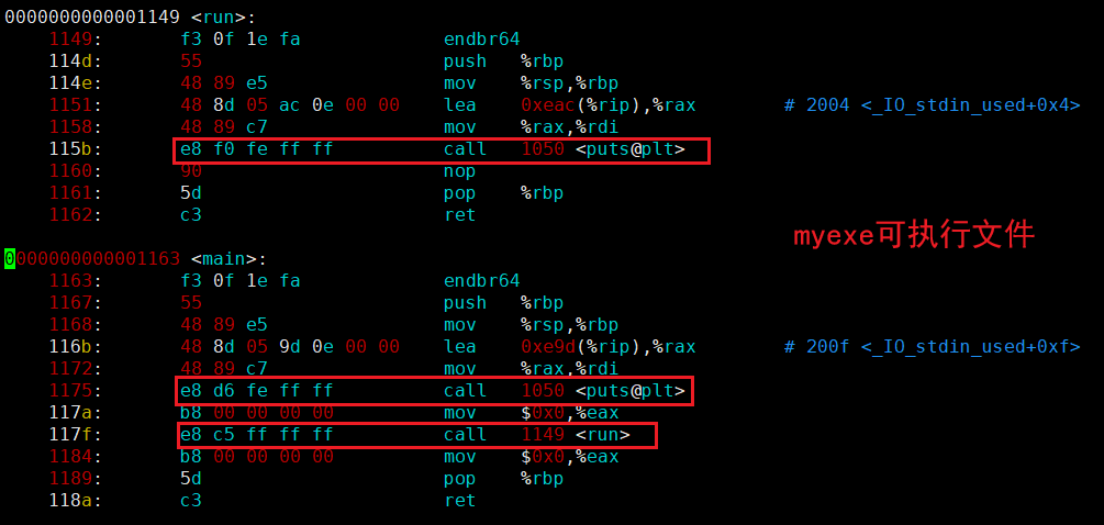 从myexe的反汇编中我们就可以看出来已经有地址了,linux系统编译形成可执行程序的时候需要对代码和数据进行编址。