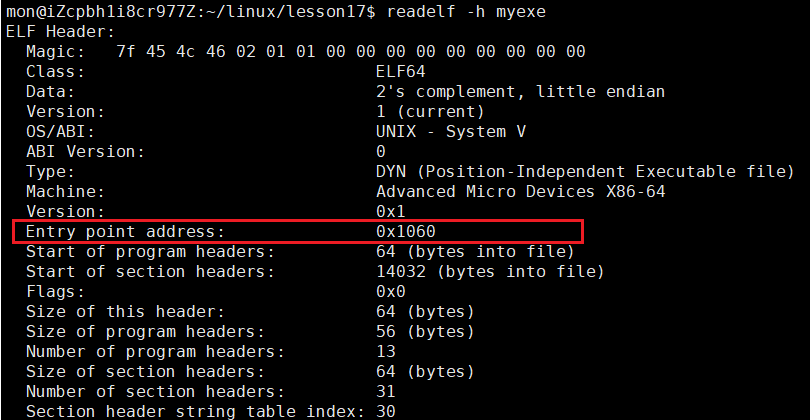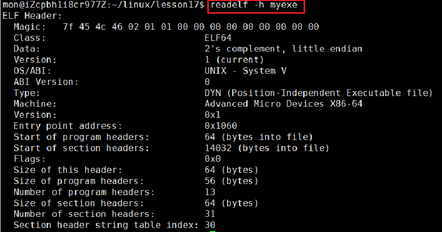 我们要查看ELF Header这部分的内容可以通过readelf -h + 文件名的命令,-h就表示Header,这里面属性还不少,我们挑一些来说。