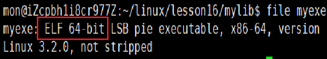 拿我们在上一篇中生成的myexe文件为例,我们通过file命令来查看myexe的相关信息,可以看到在开头就有ELF的相关字眼,表明当前文件属于ELF文件。