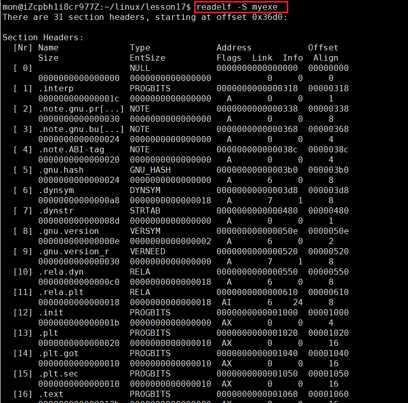 只需要将上面查看ELF Header命令中的-h改为-S即可查看Section Header Table部分的内容,在这里面我们可以看到整个Section部分中有31个section,每个section部分都有自己对应的名字和其他的各种信息。