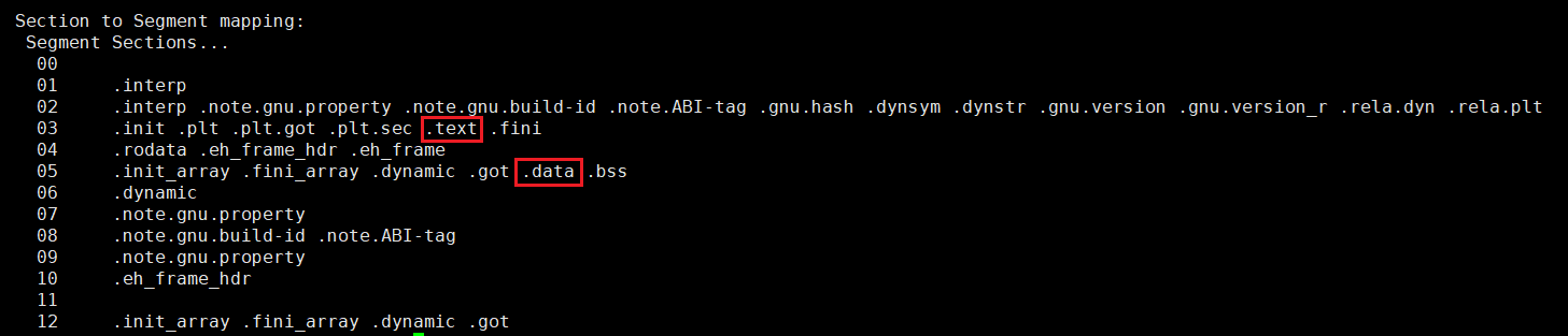而第二张图就揭示了每个segment都由哪些section所构成,可以看到我们熟悉的.text和.data,也就是代码和数据都在各自的segment中,并且他们所在的segment都是需要加载的。