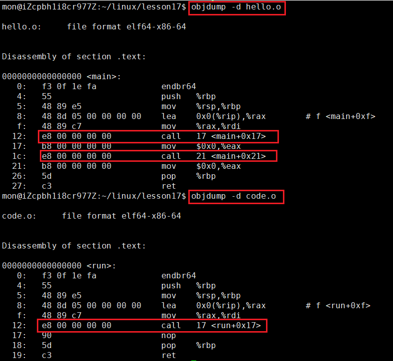 我们可以看到在hello.o和code.o这两个文件中,hello.c中调用了printf和run这两个函数,code.c中调用了printf函数,在反汇编中也可以看到在通过call指令来调用相应的函数,但是我们也发现虽然通过call指令来调用了,但是这两个函数的地址全都为0。