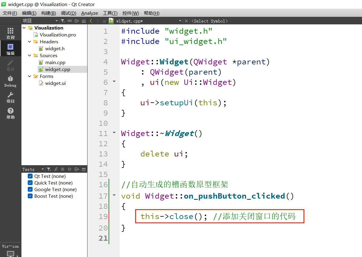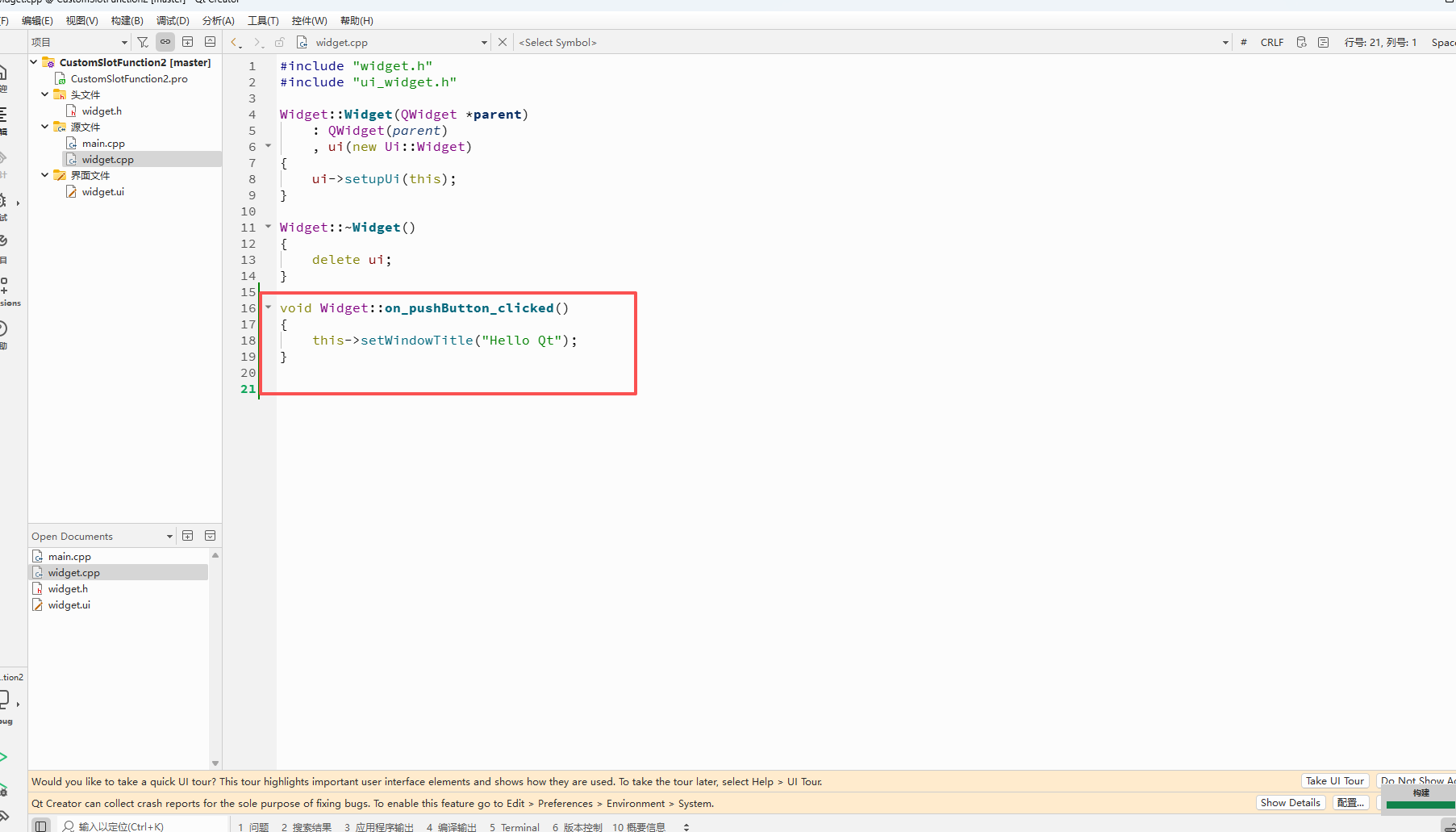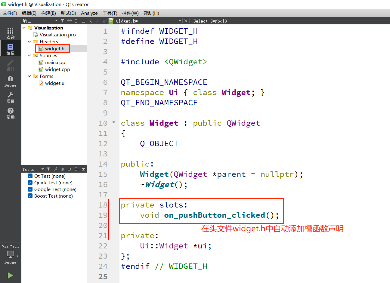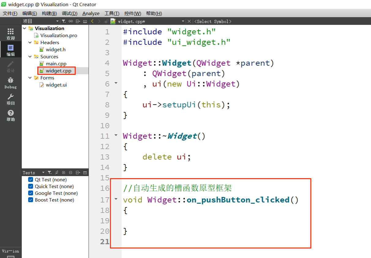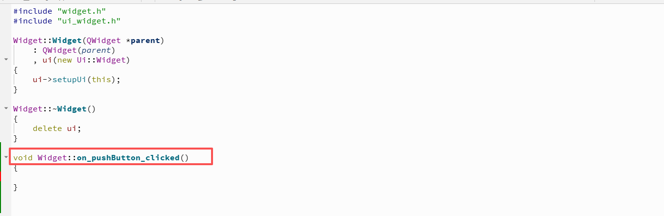 当点击确定后,Qt Creator直接给我们生成好了一个函数.只需要在其内部编写代码即可