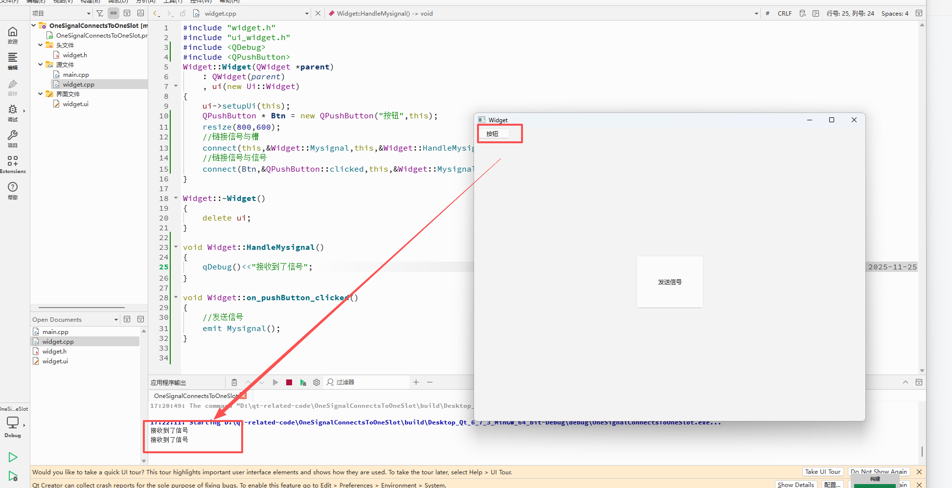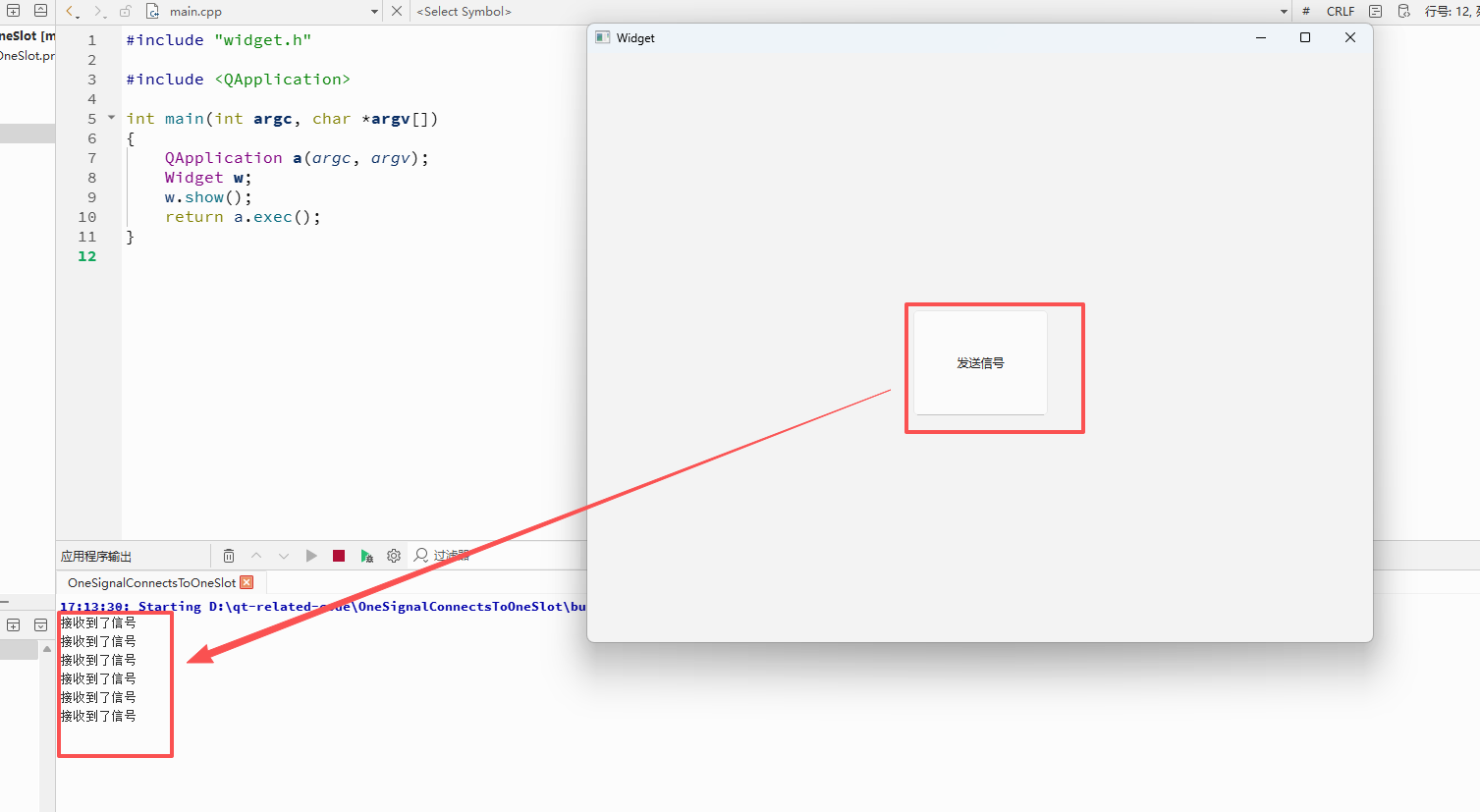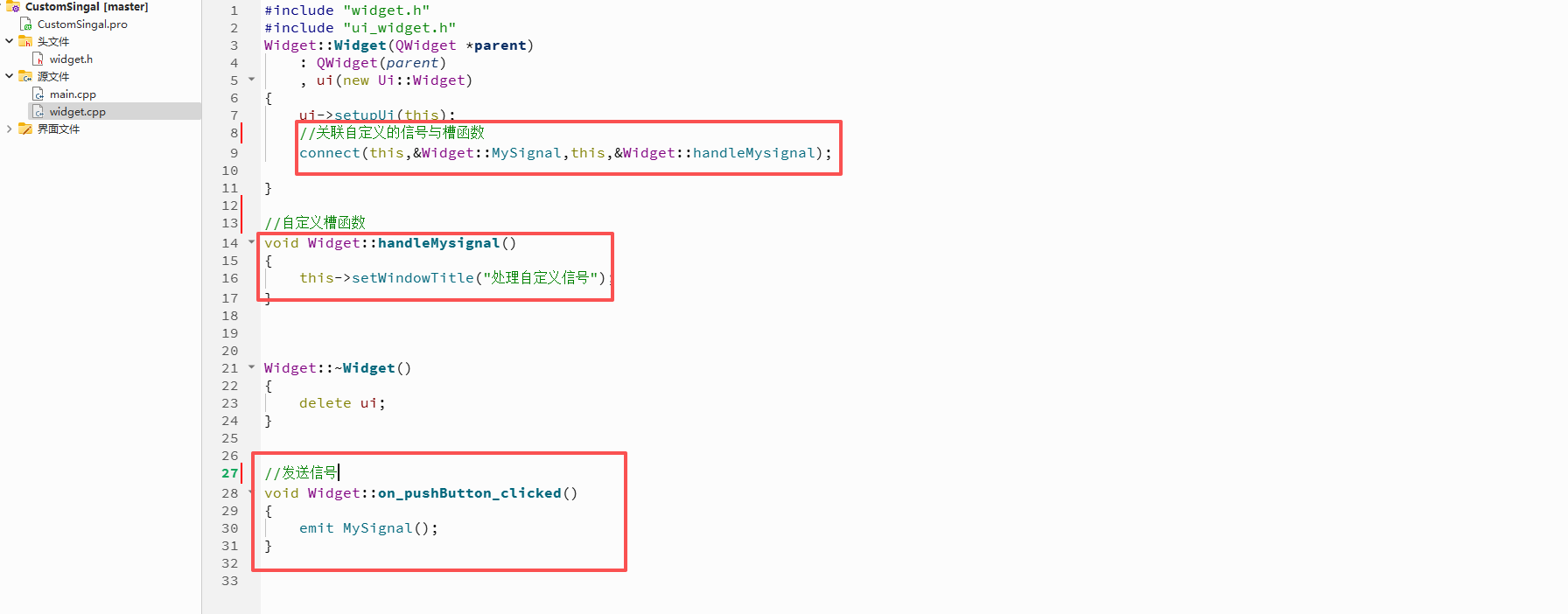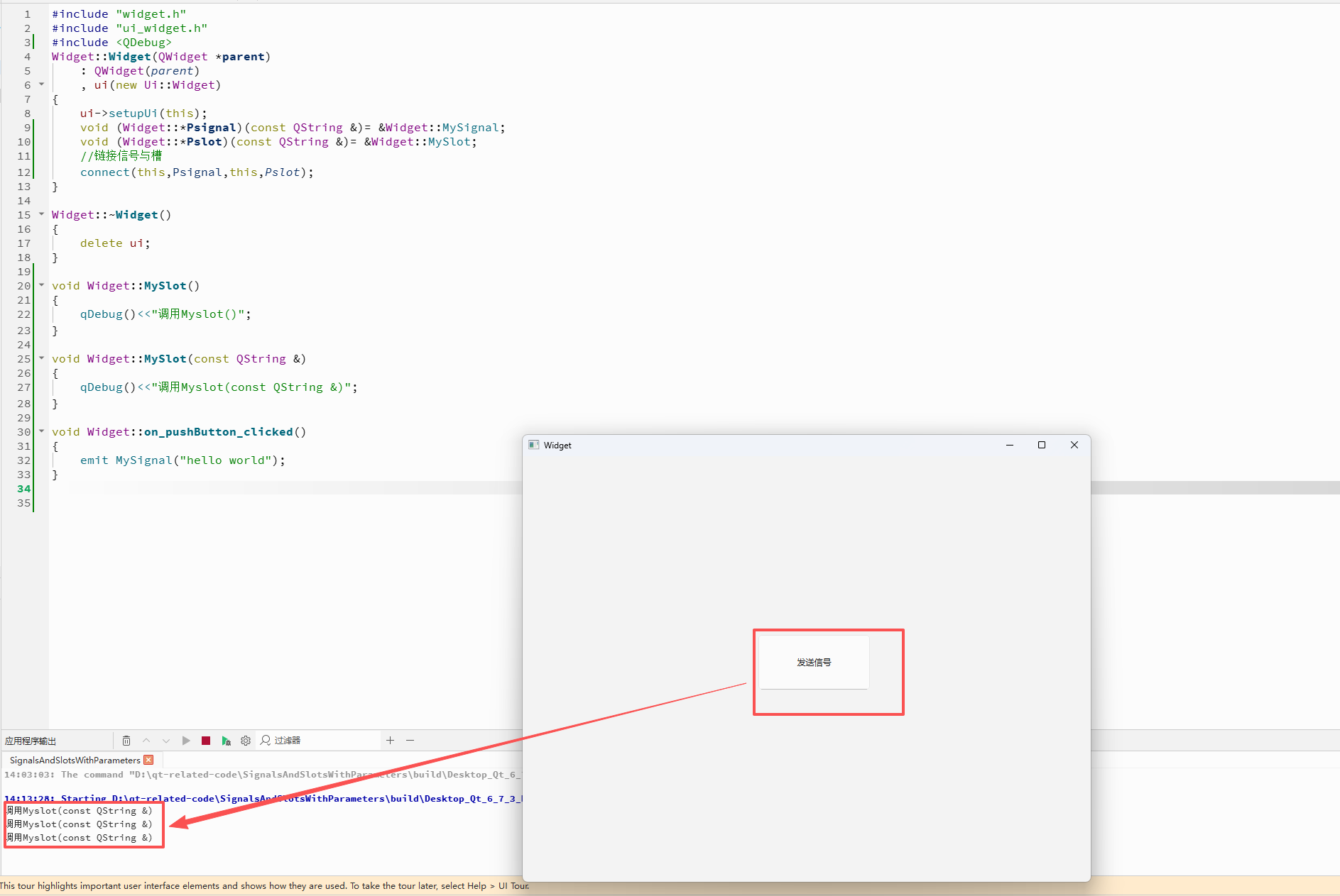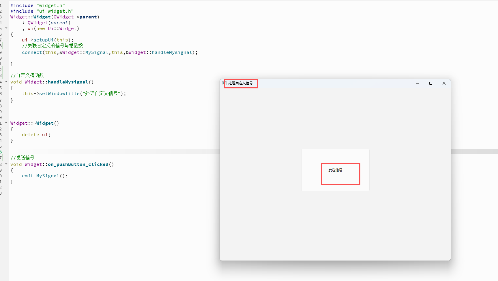 使用"emit" 关键字发送信号 。"emit" 是⼀个空的宏。"emit" 其实是可选的,没有什么含义,只是为了提醒开发⼈员。