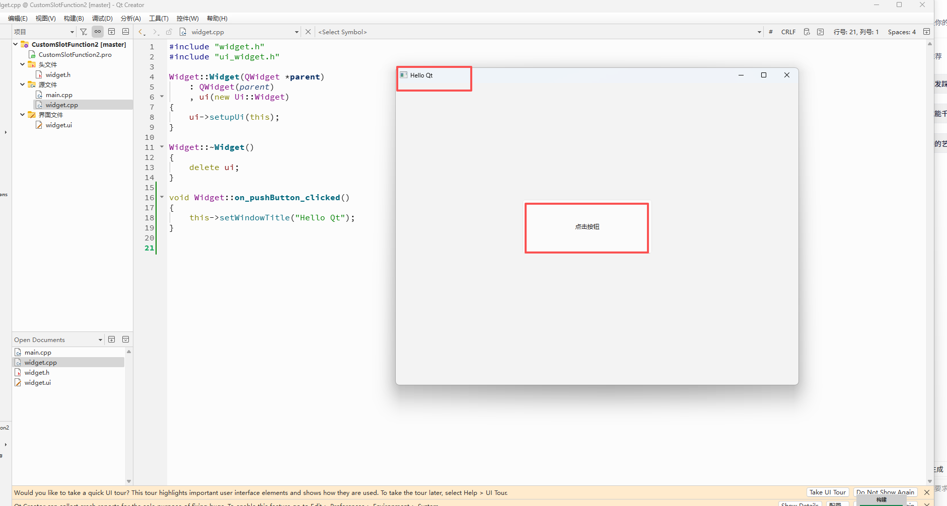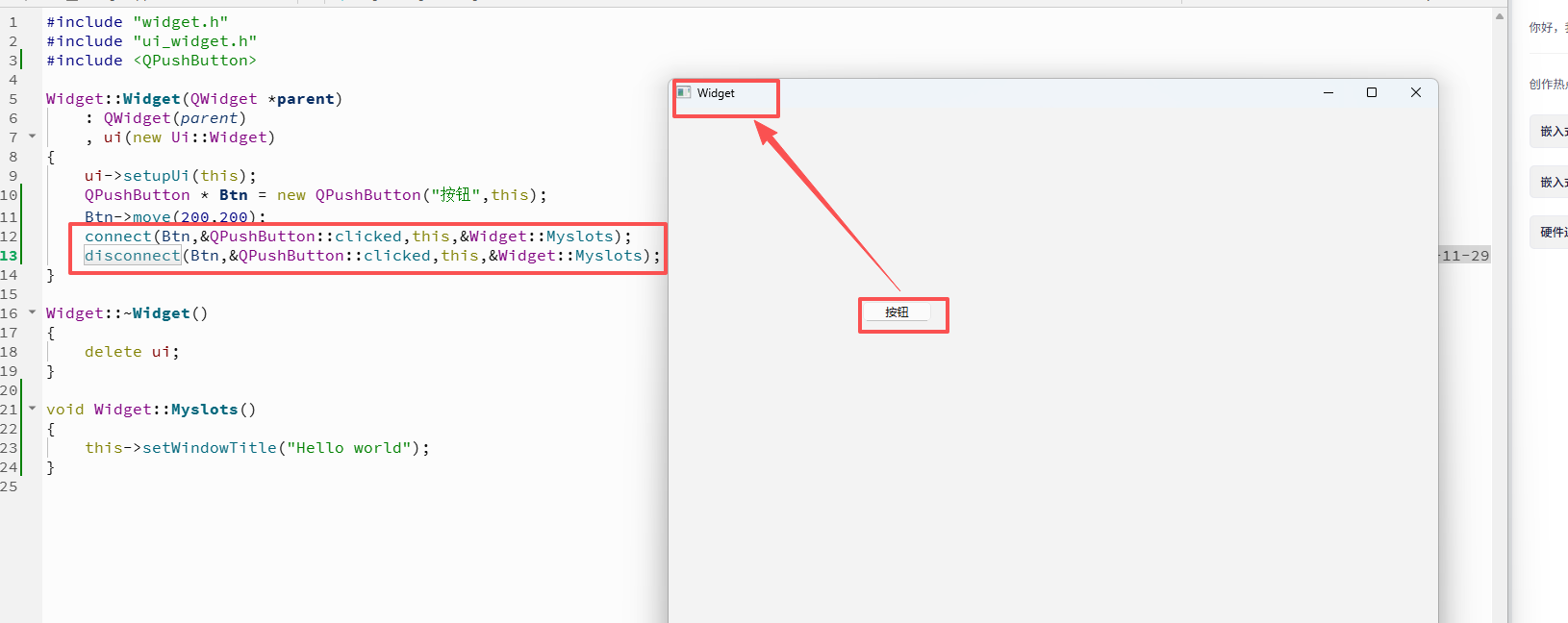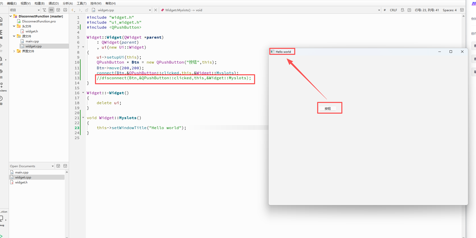 断开信号前,我们点击按钮,此时窗口的标题会显示hello world.