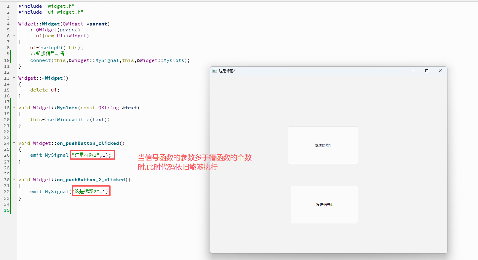 那么我们思考下,应该是要求信号的参数跟槽函数的参数一致,那么这里为什么还会允许信号的参数比槽函数的参数个数多呢