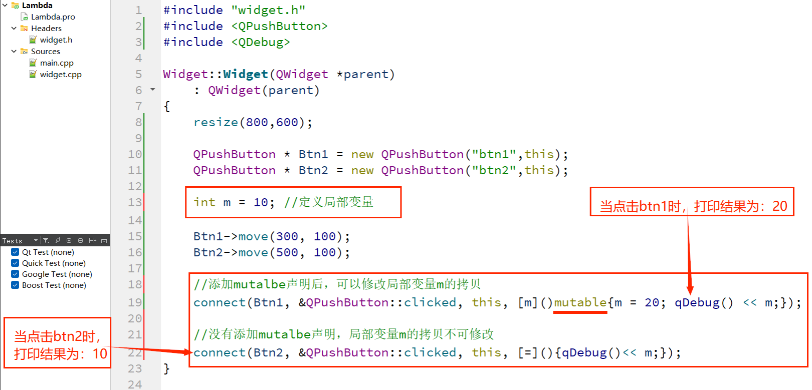 connect(Btn1,&QPushButton::clicked,this,[m]()mutable{m = 20;qDebug()<< m;});