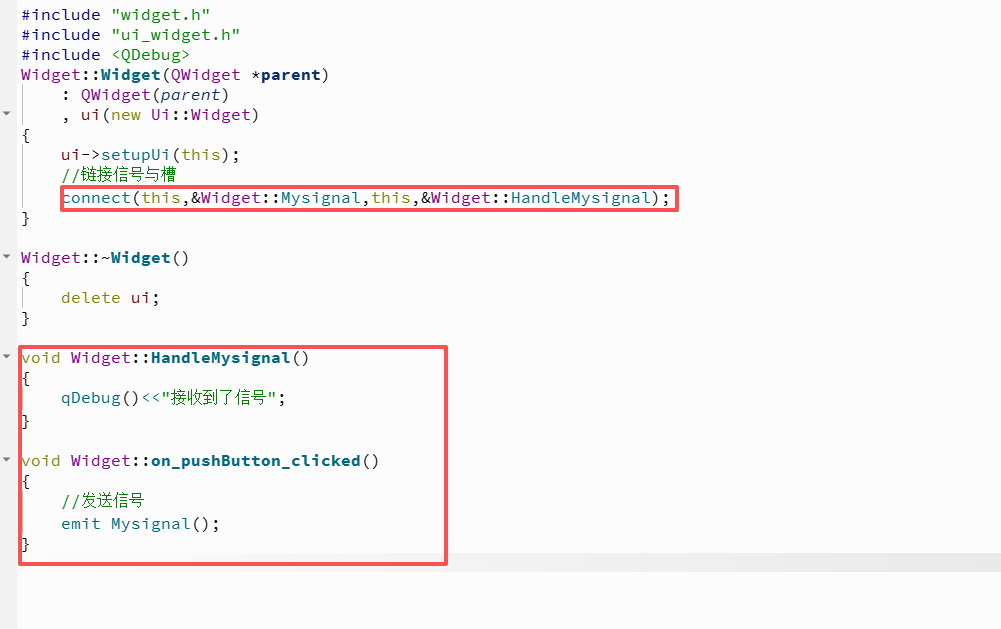 connect(this,&Widget::Mysignal,this,&Widget::HandleMysignal);