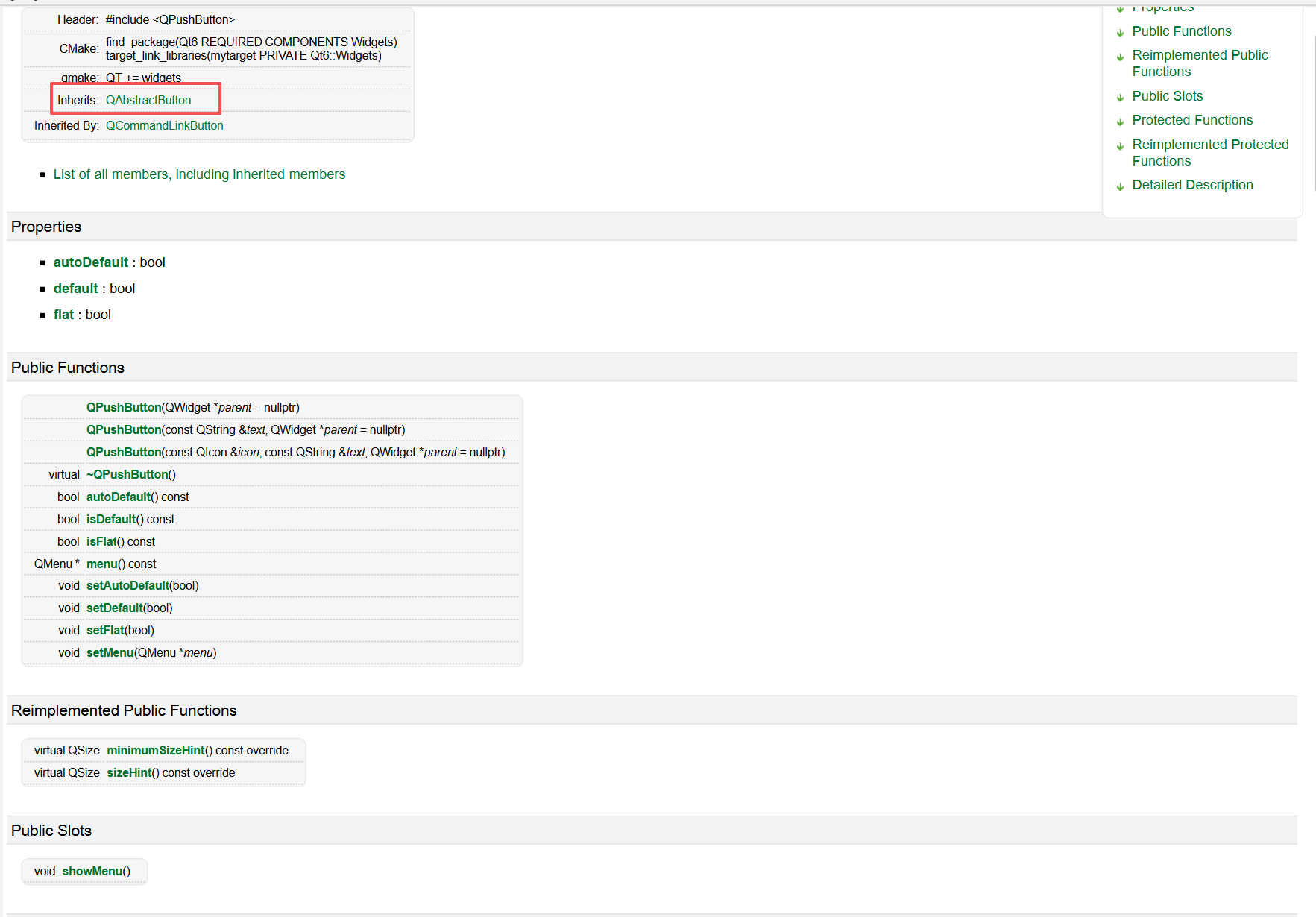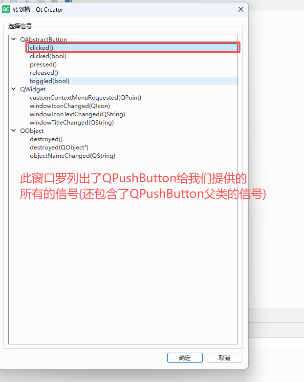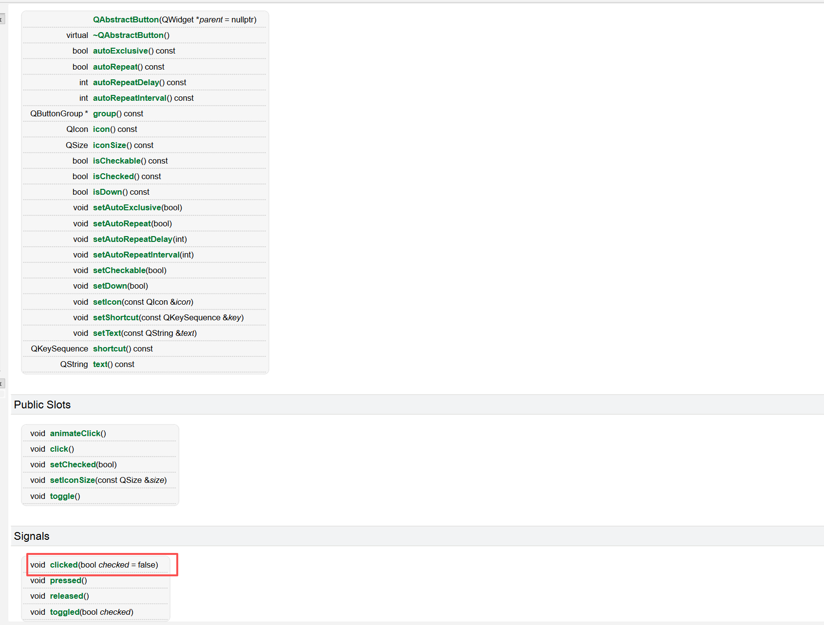 我们通过观察QPushButton,发现里头并没有clicked信号,此时莫急,当没有找到时,我们就继续去父类去查找.因此我们去他的⽗类 QAbstractButton 中继续查找关键字signals.