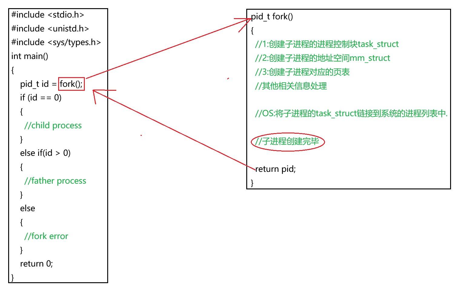 父进程调用fork函数后,为了创建子进程,fork函数内部将会进行一系列操作,包括创建子进程的进程控制块、创建子进程的地址空间、创建子进程对应的页表等等.子进程创建完毕后,操作系统还需要将子进程的进程控制块添加到系统进程列表中,此时子进程便创建完毕了