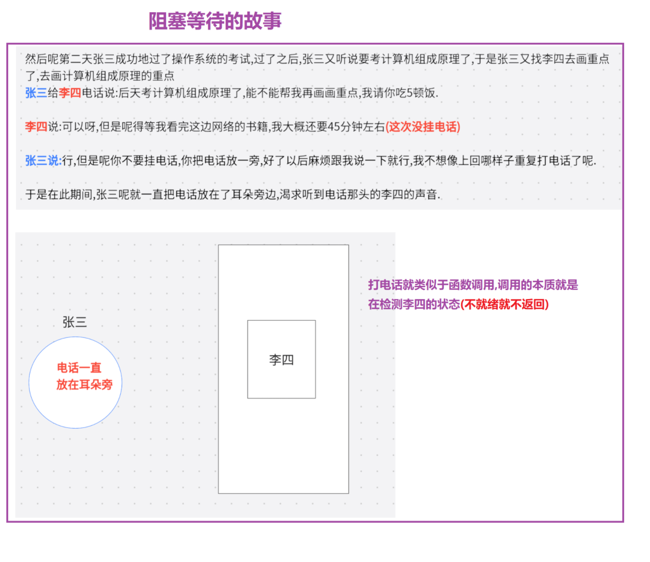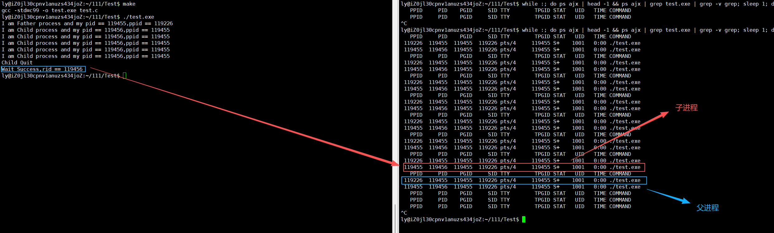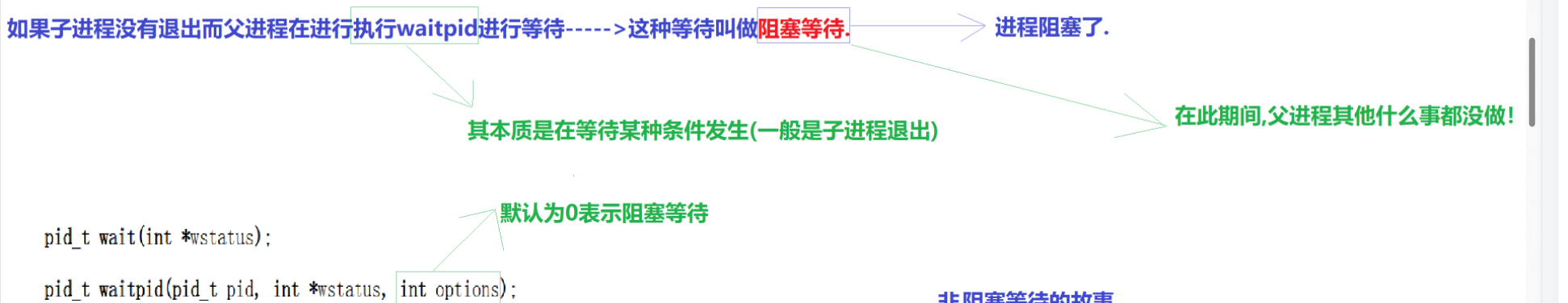 当子进程未退出时,父进程都在一直等待子进程退出,在等待期间,父进程不能做任何事情------>这种等待叫做阻塞等待.