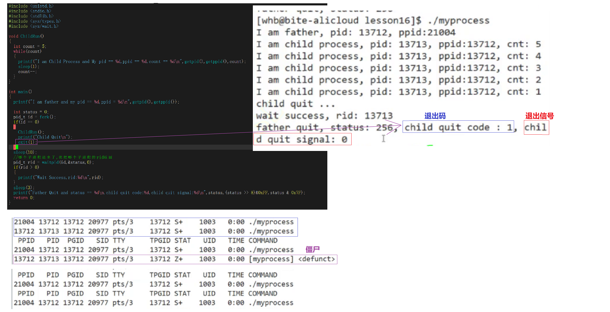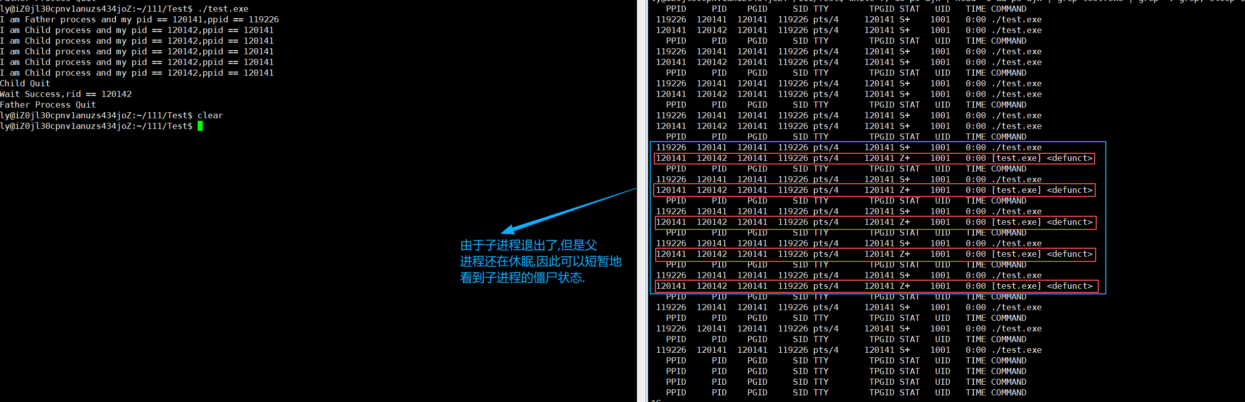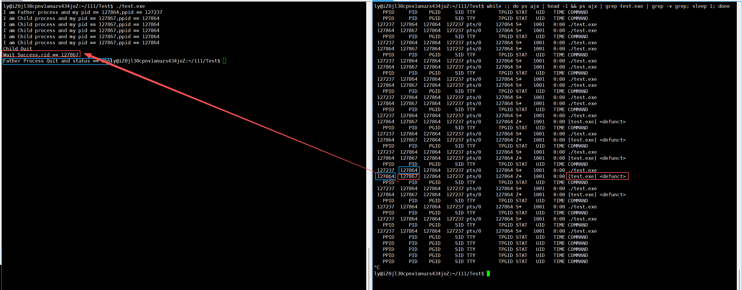 结论:任何子进程,在退出的前提下,一般必须要被父进程进行等待 进程在退出的时候,如果父进程不管不顾,那么此退出进程, 就会进入Z状态(僵尸进程)