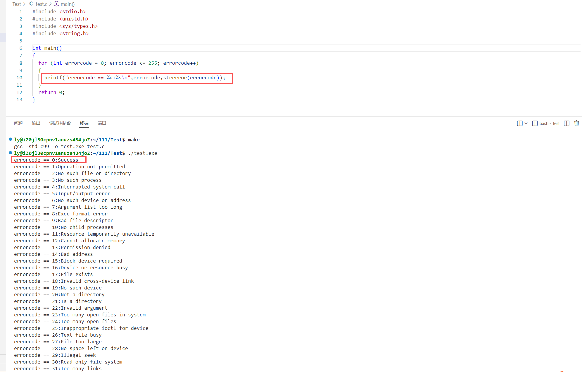 printf("errorcode == %d:%s\n",errorcode,strerror(errorcode));