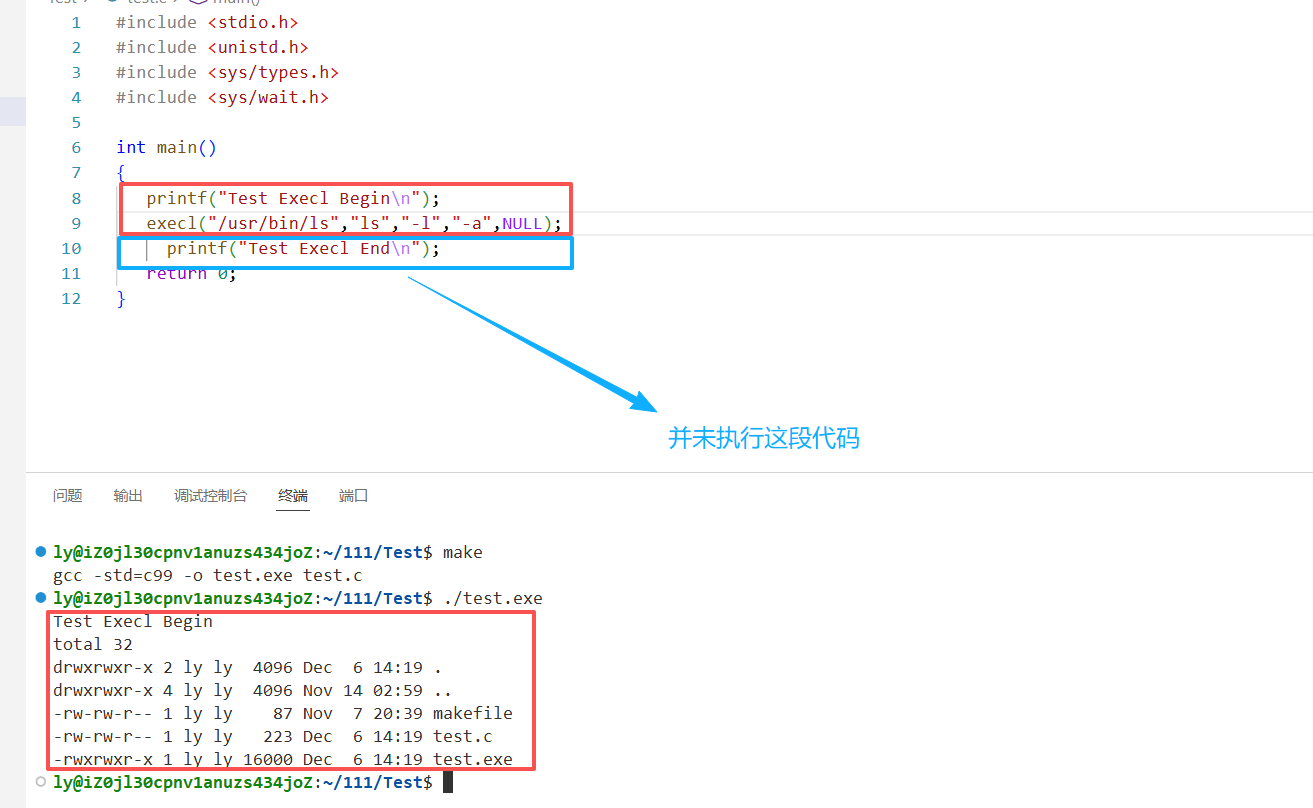 我们可以清晰地看到,上述代码并未执行 printf("Test Execl End\n");这段代码,那么这是为什么呢?这就牵扯到exec*系列函数的原理了