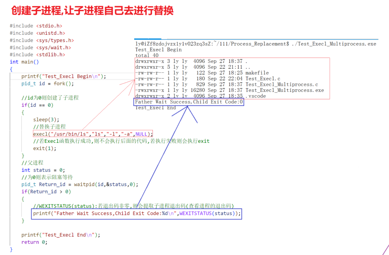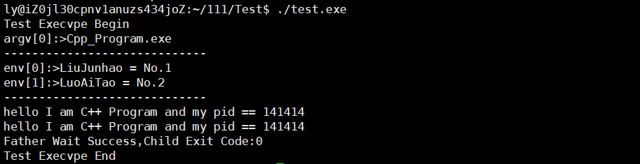 我们可以看到,退出码是0而不是0,这是因为我们创建了子进程,子进程执行了execl函数,进行了程序替换,以至于没有执行execl函数后面的代码.