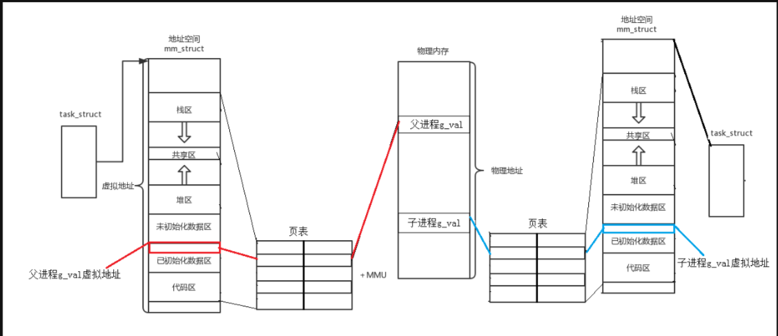 当子进程刚刚被创建时,子进程和父进程的数据和代码是共享的,即父子进程的代码和数据通过页表映射到物理内存的同一块空间。只有当父进程或子进程需要修改数据时,才将父进程的数据在内存当中拷贝一份,然后再进行修改。