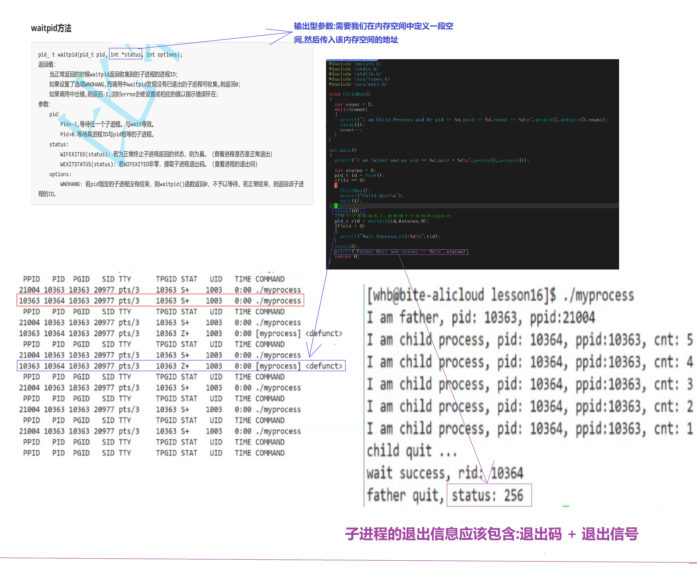 参数: pid: Pid = -1,等待任何一个子进程,与wait等效. Pid > 0,等待其进程id与pid相等的子进程. status(输出型参数,获取子进程的退出状态): WIFEXITED(status):若为正常终止子进程返回的状态,则为真.(查看进程是否是正常退出) WEXITSTATUS(status):若WIFEXITED为非零,提取子进程退出码.(查看进程的退出码) 不关心则可设置为NULL. options: WNOHANG:若pid指定的子进程没有结束,则waitpid()函数返回0,不予以等待.若正常结束,则返回该子进程的id.