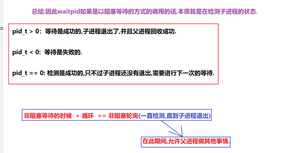 例如,父进程可以隔一段时间调用一次waitpid函数,若是等待的子进程尚未退出,则父进程可以先去做一些其他事,过一段时间再调用waitpid函数读取子进程的退出信息。