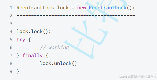 在synchronized之前,代码普遍使用ReenTranLock锁,它是一种可重入互斥的锁。 主要方法: lock(): 加锁, 如果获取不到锁就死等. trylock(超时时间): 加锁, 如果获取不到锁, 等待⼀定的时间之后就放弃加锁. unlock(): 解锁 他在使用时需要手动加锁释放锁,所以要注意防止释放锁的代码没有执行: