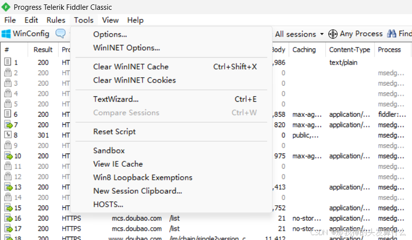Fiddler 默认颜色规则(对应你截图里的情况): 蓝色:对应 HTML 类资源(Content-Type 为text/html),比如截图里第 5 行的text/html; 紫色:对应 CSS 样式文件(Content-Type 为text/css),比如截图里第 9、10 行的text/css; 黄色:对应图片资源(Content-Type 为image/png/image/jpg等),比如截图里第 23 行的image/png; 绿色(截图里部分行):对应 JavaScript 文件(Content-Type 为application/javascript/text/javascript); 黑色 / 灰色:对应 “Tunnel 隧道请求”(比如截图里的Tunnel to行),是 HTTPS 连接时的加密通道建立请求。