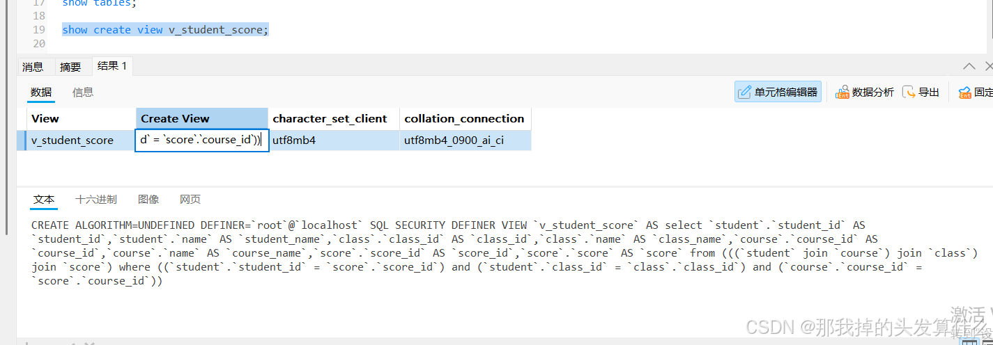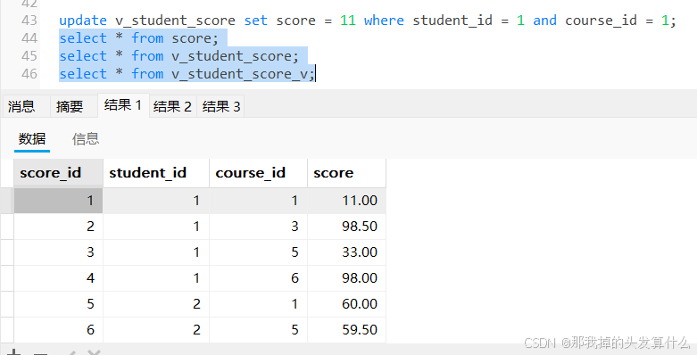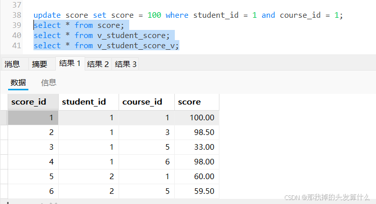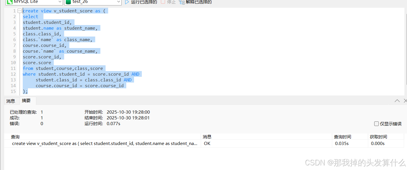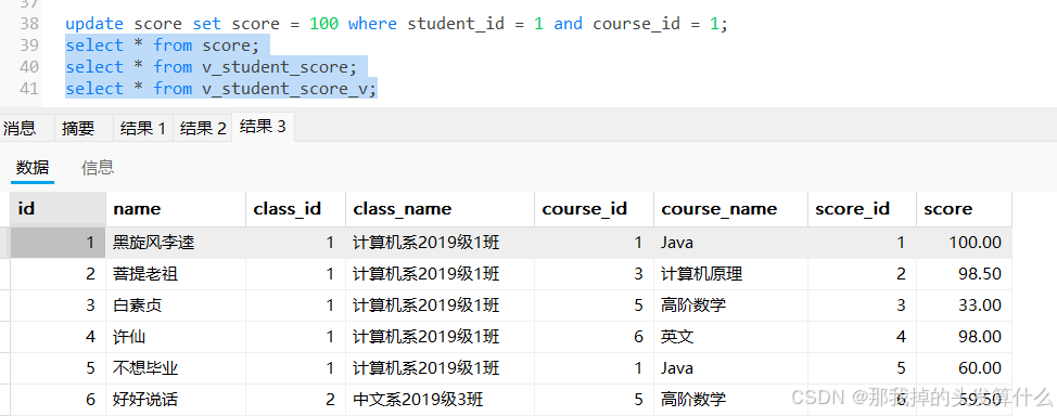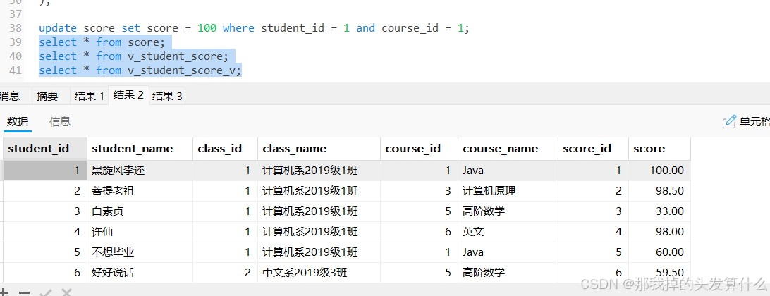 create view v_student_score_v (id,name,class_id,class_name,course_id,course_name,score_id,score)as (