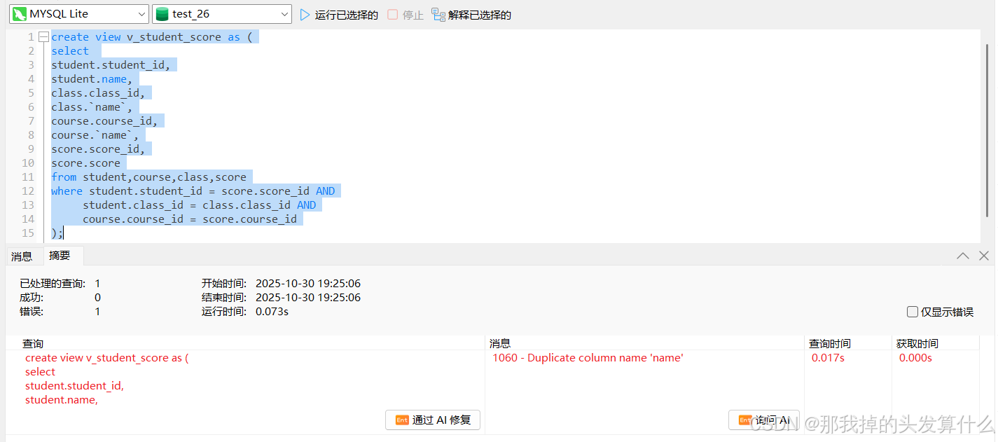 定义视图时出现了重复的列的报错,我们需要给每一个列起别名。