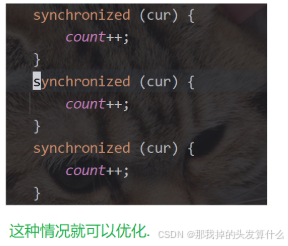 编译器优化的体现。编译器会判定当前代码是否需要加锁,如果加的锁是无意义的锁,编译器会自动把synchronized消除,以此来提高效率。 此处的优化不像之前提到的优化那样造成线程安全问题。这里的优化是很保守的,在保证线程安全的情况下进行优化。所以这意味着,编译器只会优化掉它百分百确定的多加的锁,所以可能会漏掉该优化的锁。所以不能单单依靠编译器的优化来避免多使用锁,而是使用时就需要注意。