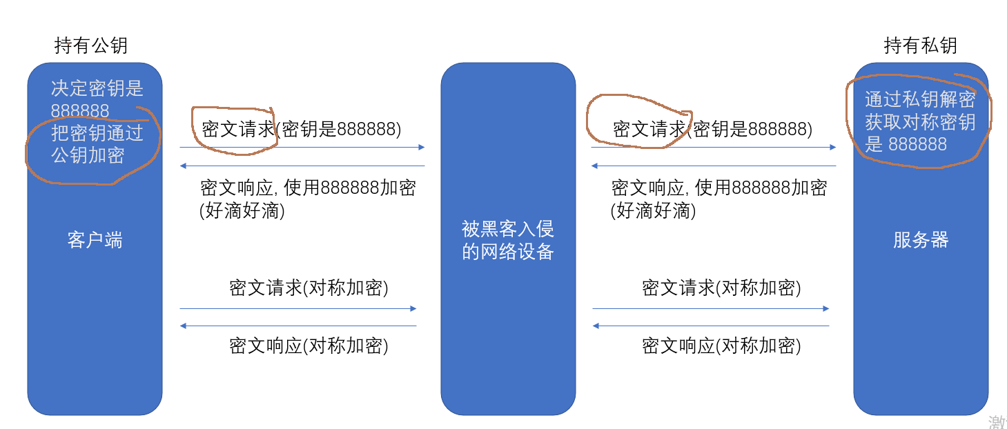 不过嘛~肯定还没有那么简单 ,上面这个图片展示的交互过程看似简单实则暗藏玄机!黑客确实没法直接拿到你的业务数据, 但是密钥是明文传输啊,我先截取你的密钥然后再解密你的内容不就行了??