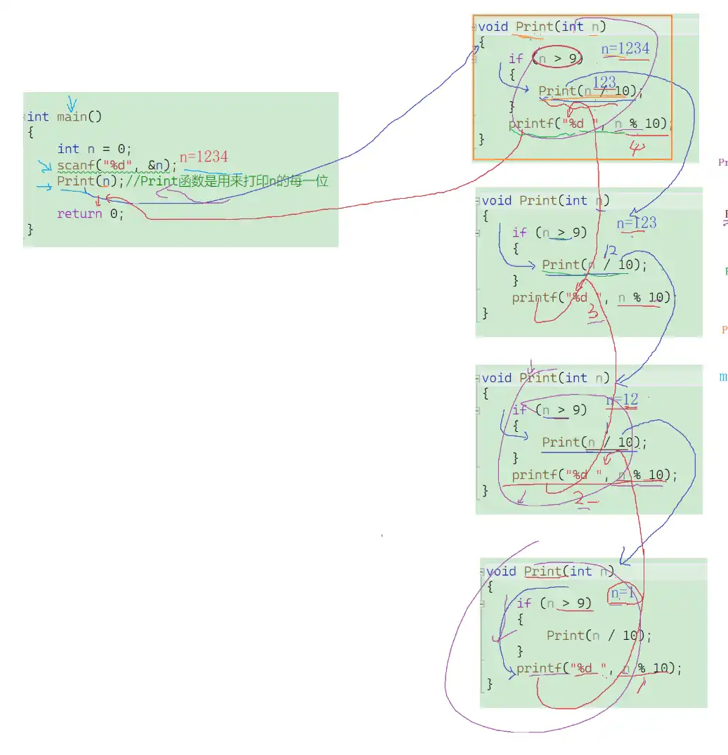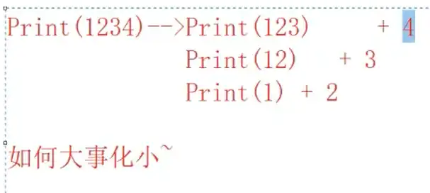 分析思路:以4位数为例,把4位拆成3位加一位,层层往下,递归的限制条件为多位数(n>9),递推的停止条件为一位数,每次n/10为print的参数,逐渐向停止条件靠近