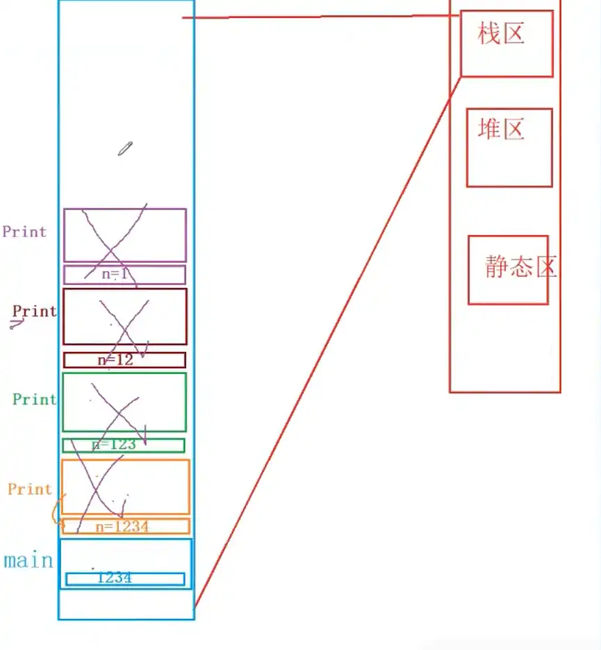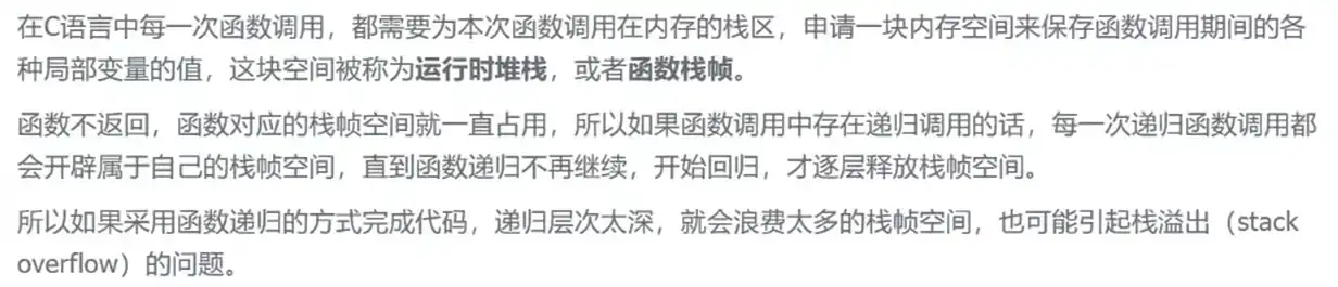 }但是上面是个死递归,最终会导致栈溢出(因为每一次函数调用都会向栈区申请空间,运行时堆栈) 递归层次太深也可能导致栈溢出的情况