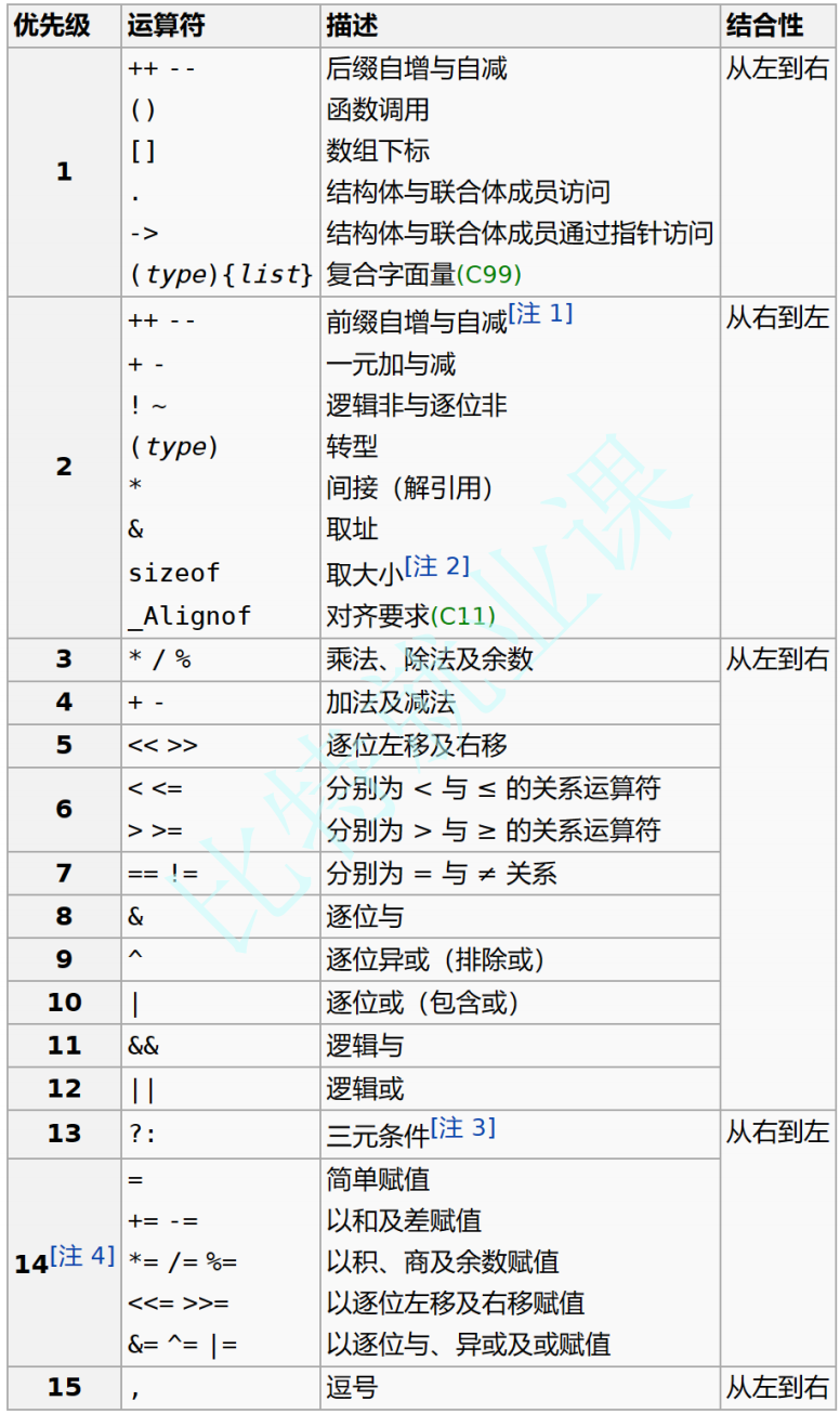 运算符的优先级顺序很多,下⾯是部分运算符的优先级顺序(按照优先级从⾼到低排列),建议⼤概记住这些操作符的优先级就⾏,其他操作符在使⽤的时候查看下⾯表格就可以了。