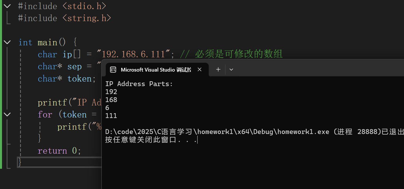 }思路:遍历 haystack 的每一个位置,尝试与 needle 匹配。十一、strtok:字符串分割的利器