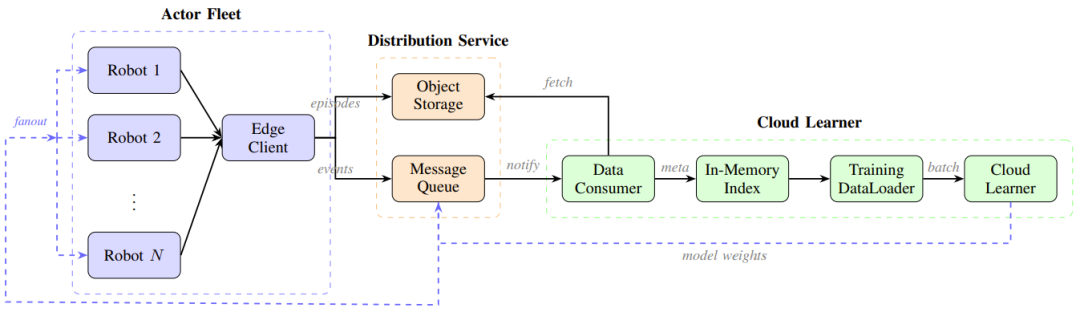 系统采用了先进的 Actor-Learner 分离架构,通过消息队列完全解耦了数据生产与消费。这意味着系统具备了「零配置」的弹性水平扩展能力:新的机器人加入集群无需修改任何代码或停机配置,只需连接消息队列即可即插即用,自动分担数据采集任务。