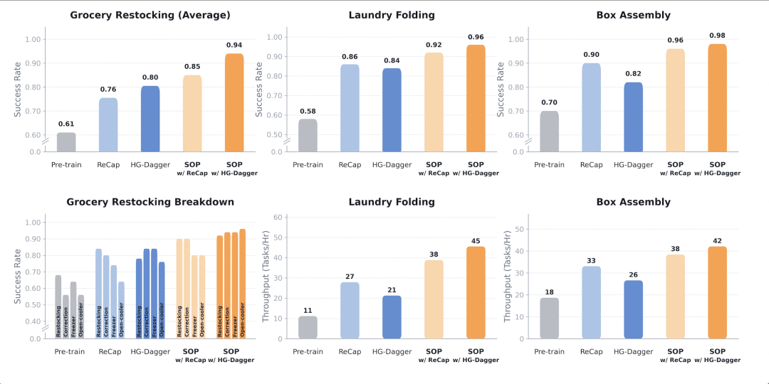 在有效性验证中,团队选择了 HG-DAgger(典型的单机在线算法)和 RECAP(最新的 SOTA 离线方法)作为对比基准。实验设计非常直观:先看基线模型表现,再看经过这些算法打磨后的效果,最后看接入 SOP 框架后的「终极形态」。