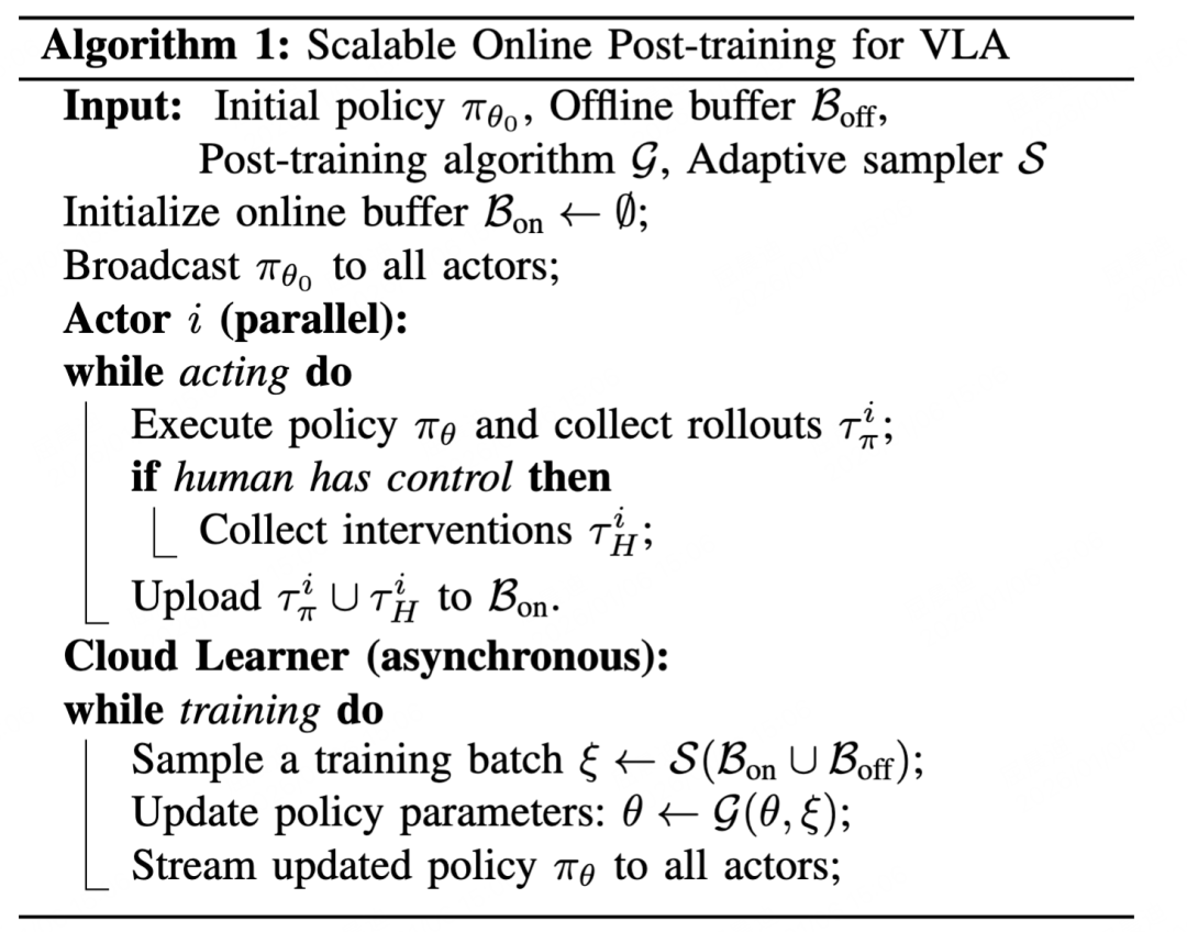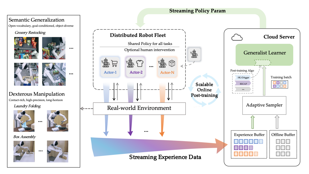 为了解决这个问题,传统的做法是后训练(post-training)。但这通常是一条离线、单机、顺序的漫漫长路:采集数据、离线训练、更新模型、再次部署。这种模式下,机器人探索慢、迭代慢,且很容易在学习新任务时遗忘旧能力。