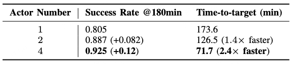 在严格限制总训练时长为 3 小时的前提下,四机并行学习的最终成功率达到了 92.5%,比单机提升了 12%。更关键的是,SOP 成功将硬件的扩展转化为了学习时长的极致压缩。要达到 80% 的性能基准线,单机苦练需要 174 分钟,而四机战队仅需 72 分钟,训练速度达到原来的 2.4 倍。