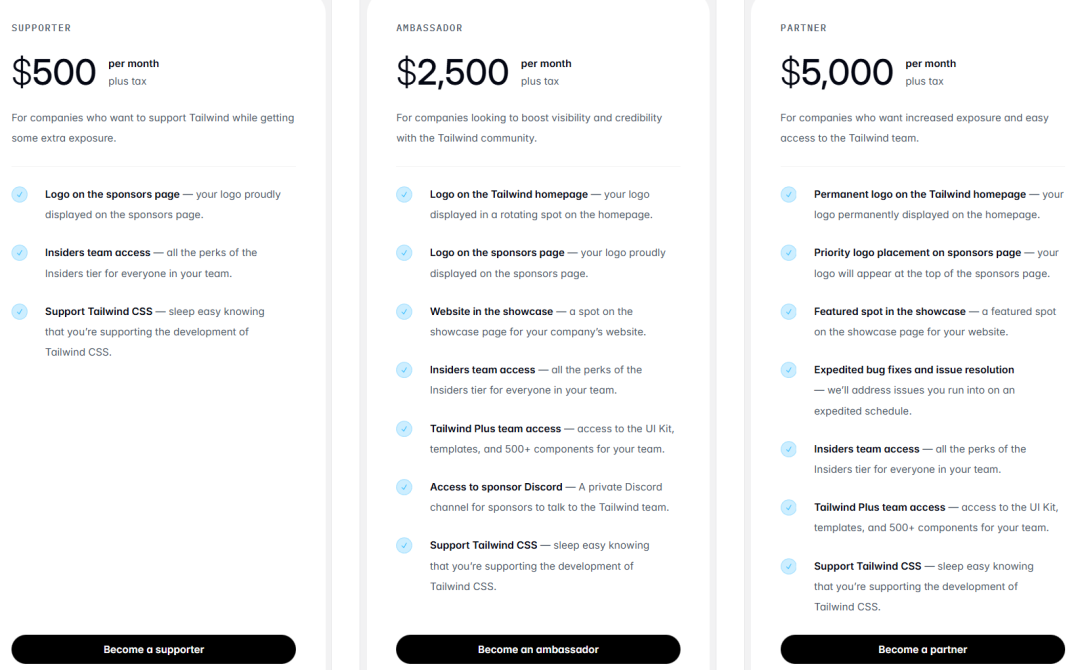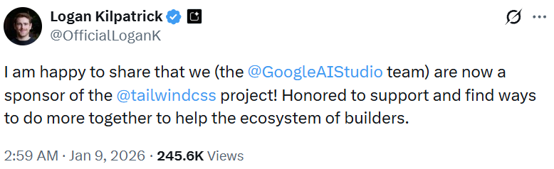 9 号上午,谷歌 AI Studio 产品负责人 Logan Kilpatrick 也宣布了赞助 Tailwind 项目(每年 5000 美元的 Partner 档位)。对于像谷歌和 Cursor 这样直接受益于高质量 AI 编程体验的公司来说,确保 Tailwind 继续维护显然符合他们的利益。毕竟,如果底层框架死了,AI 生成的代码质量也会随之下降。