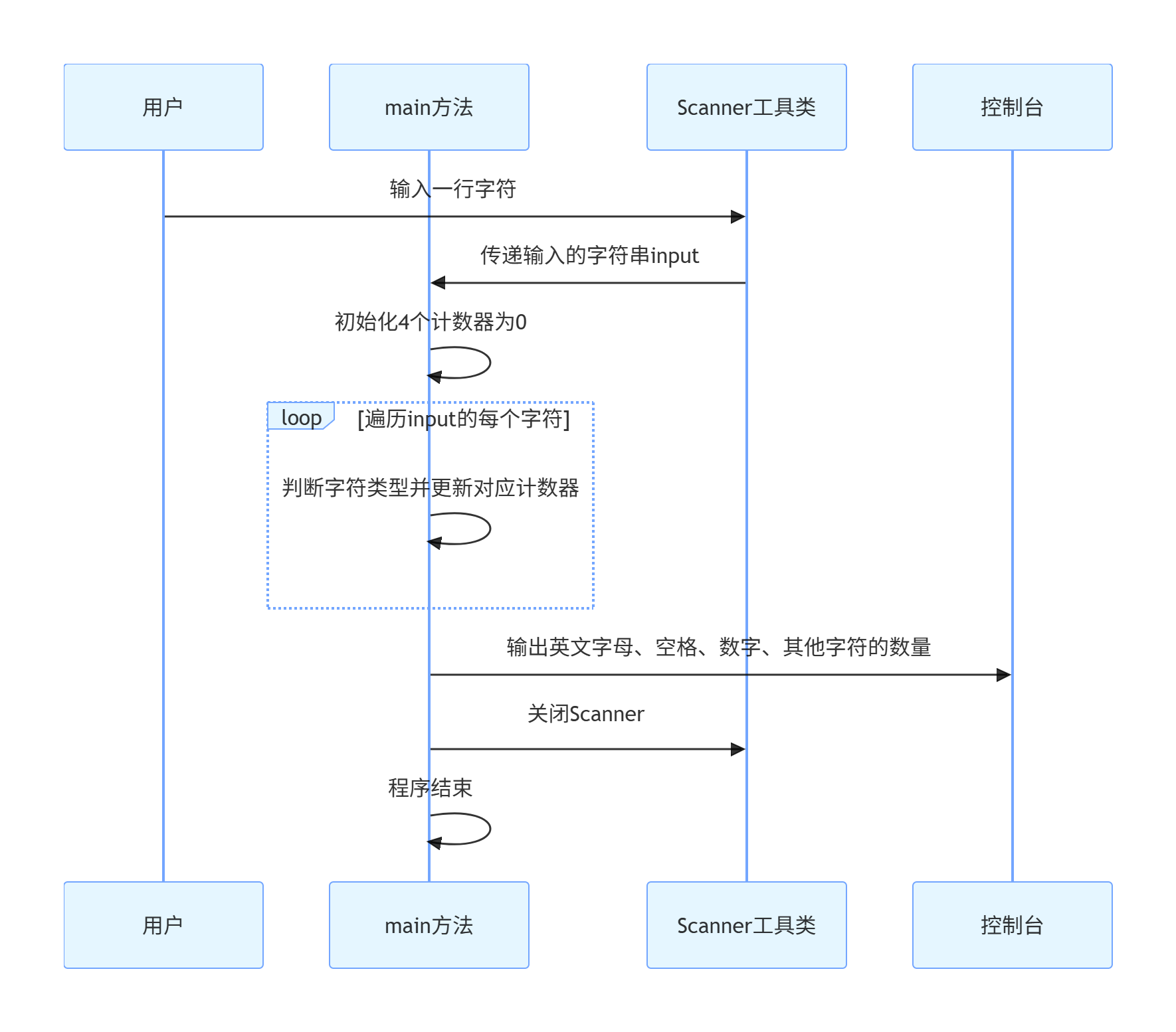 }使用 for 循环遍历输入字符串的每个字符。根据字符的类型(字母、数字、空格或其他),增加相应的计数器。