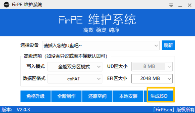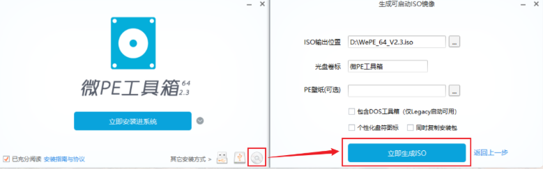 打开应用后,点击生成ISO并选择存放位置,存放位置可设置为 U 盘。