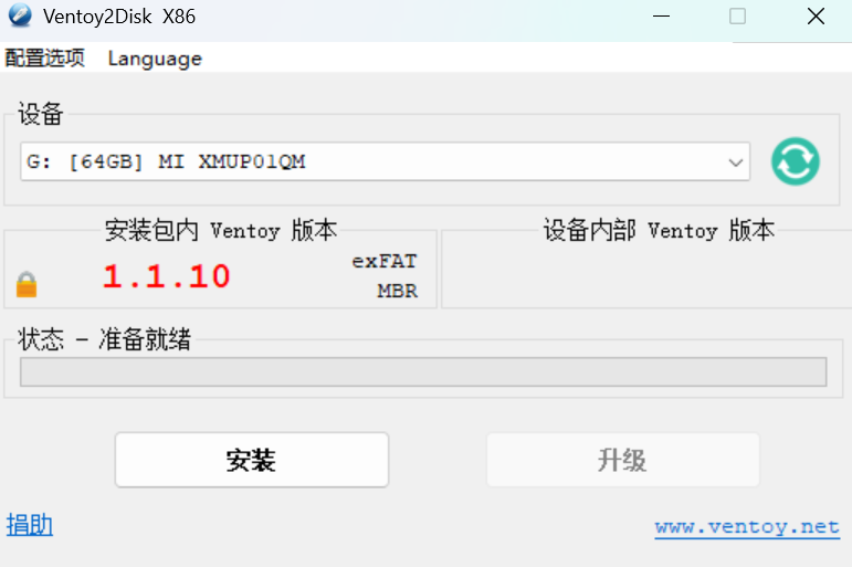 点击安装,当进度条完成并且设备内部 Ventoy 版本中出现版本号即为安装成功。