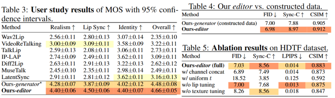 在标准数据集和我们要新提出的高难度基准 ContextDubBench 上的广泛实验表明,本文方法取得了SOTA结果。X-Dub 在复杂的野外场景中表现出卓越的鲁棒性,显著优于先前的工作。相信这项工作不仅为视觉配音树立了新标准,也为其他缺乏成对数据的条件视频编辑任务提供了宝贵的见解。