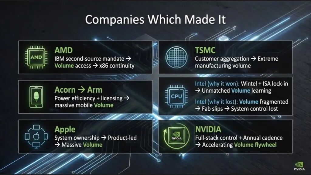 让我们深入研究那些在英特尔主导的PC时代真正存活下来的公司。以下列表在我们看来具有启发性。AMD、Acorn(原始ARM)、苹果、台积电、英特和Nvidia。每家公司都走了不同的道路,但它们有一个共同的底层特征——规模。