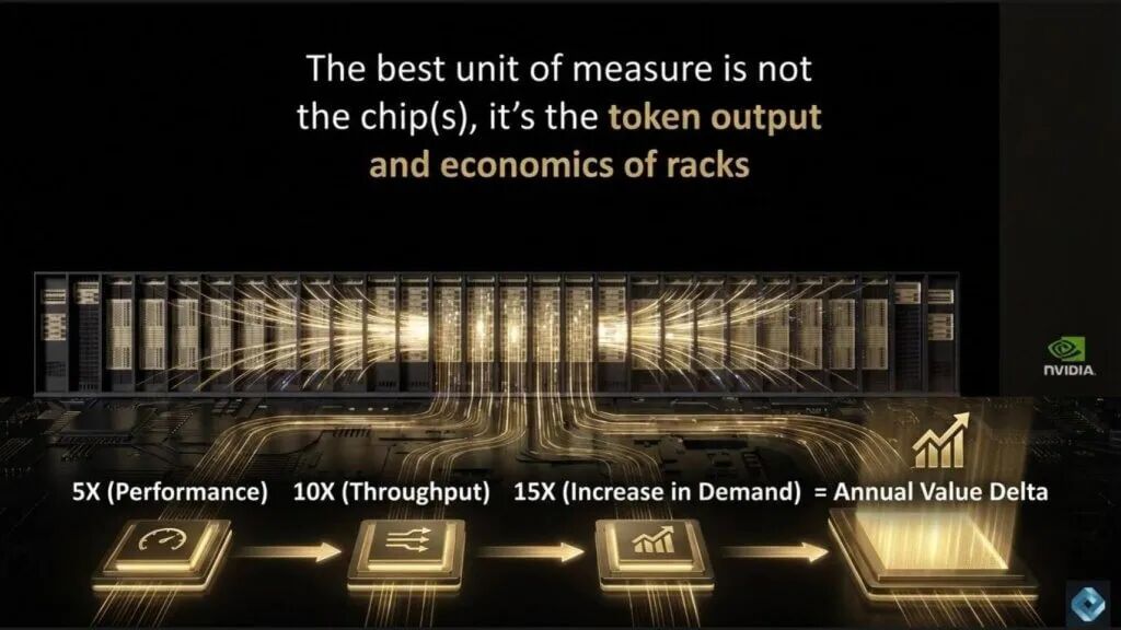 从Nvidia的公告中变得更清晰的一个关键点是,芯片不是正确的测量单位。系统才是。更准确地说,是机架——最终是每个机架的token输出——定义了性能、经济性和价值。